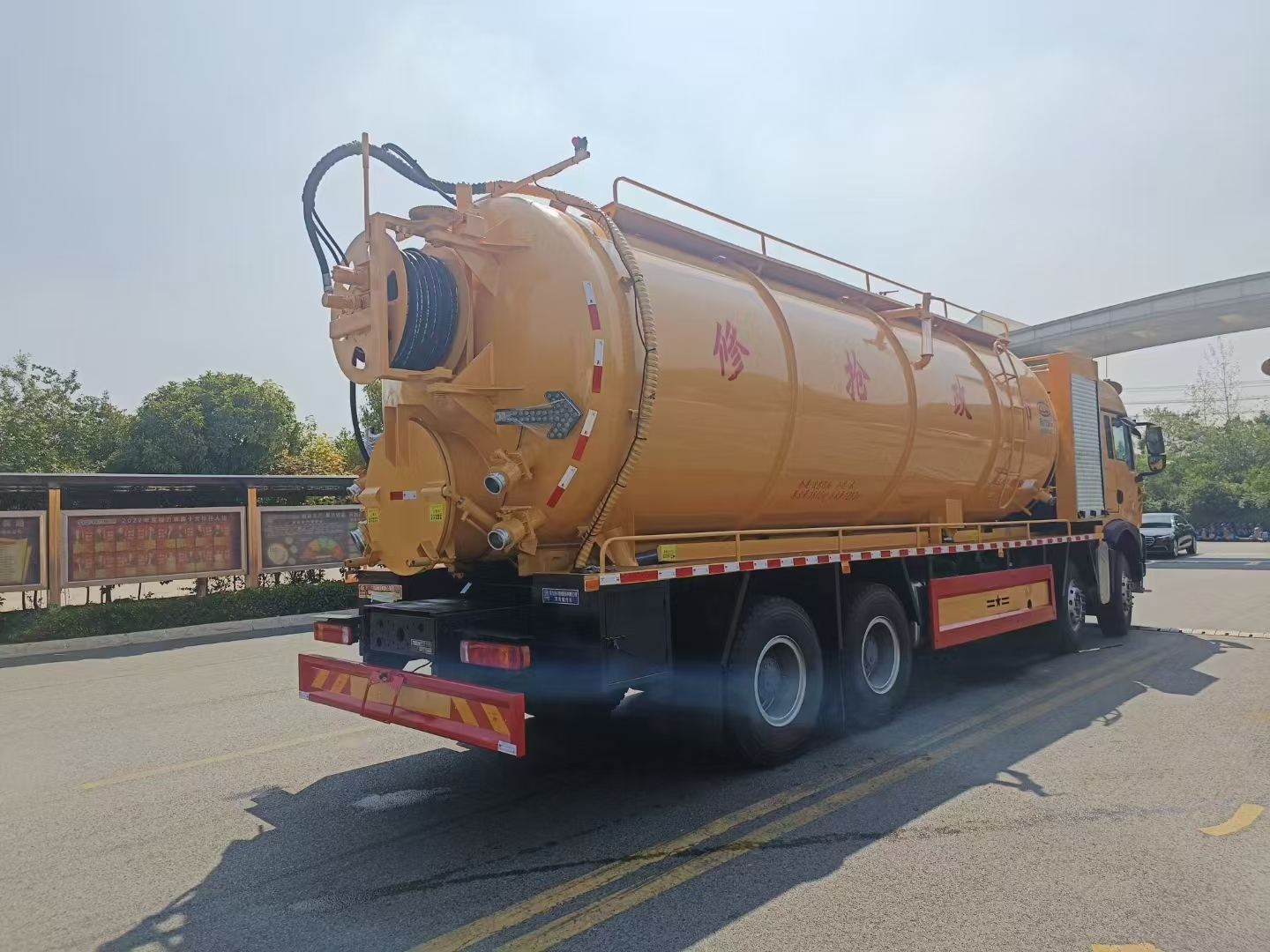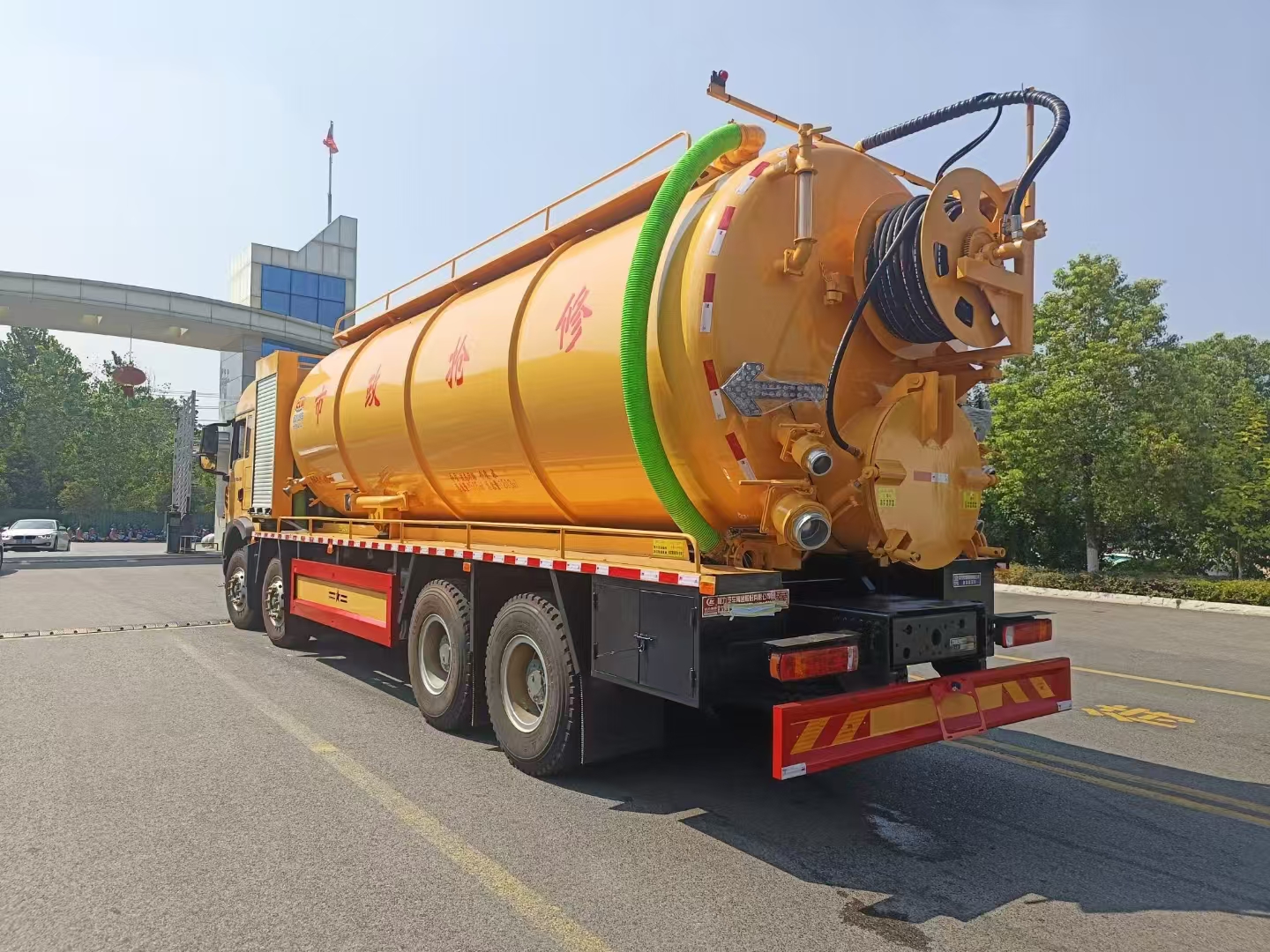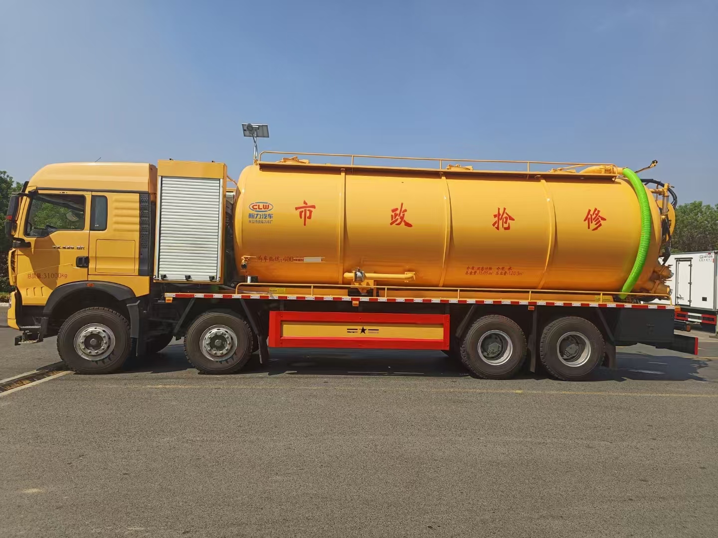 上裝配置 罐體總容積約33立方,清水箱約10立方,其余為污水罐,加強大架,兩倉互通,采用8mm碳鋼制作,吸污部分,副發采用420馬力配258水循環泵,8米吸污管,罐體兩側加寬平臺加護欄,后部開一個600mm液壓開啟排污口,一個150排污球閥,和一個100的排污球閥,100內抽球閥,后部左右各一個箭頭燈,配品浮350流量,配100米內徑25定制耐磨高壓管,帶卷盤,卷盤液壓左右旋轉。